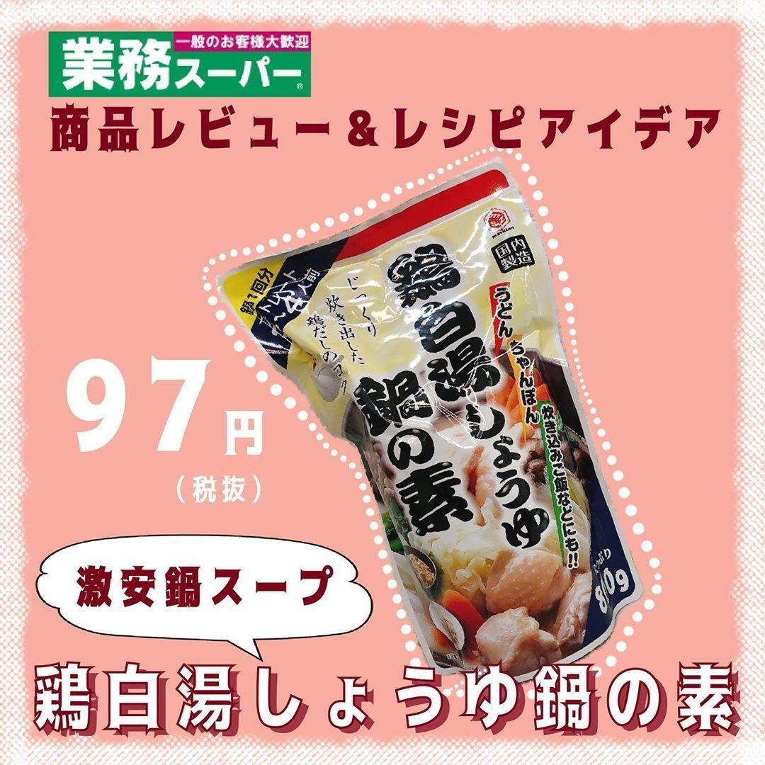 業務スーパーの食材を使ったアイデアレシピが人気のmayu.kakei_28さんは節約上手!今回業務スーパーで購入したのはおどろきの安さの鍋スープです。なんと97円にも関わらず国内製造で味もおいしいのだとか。鶏白湯しょうゆ味の〆はラーメンがオススメだそうです。