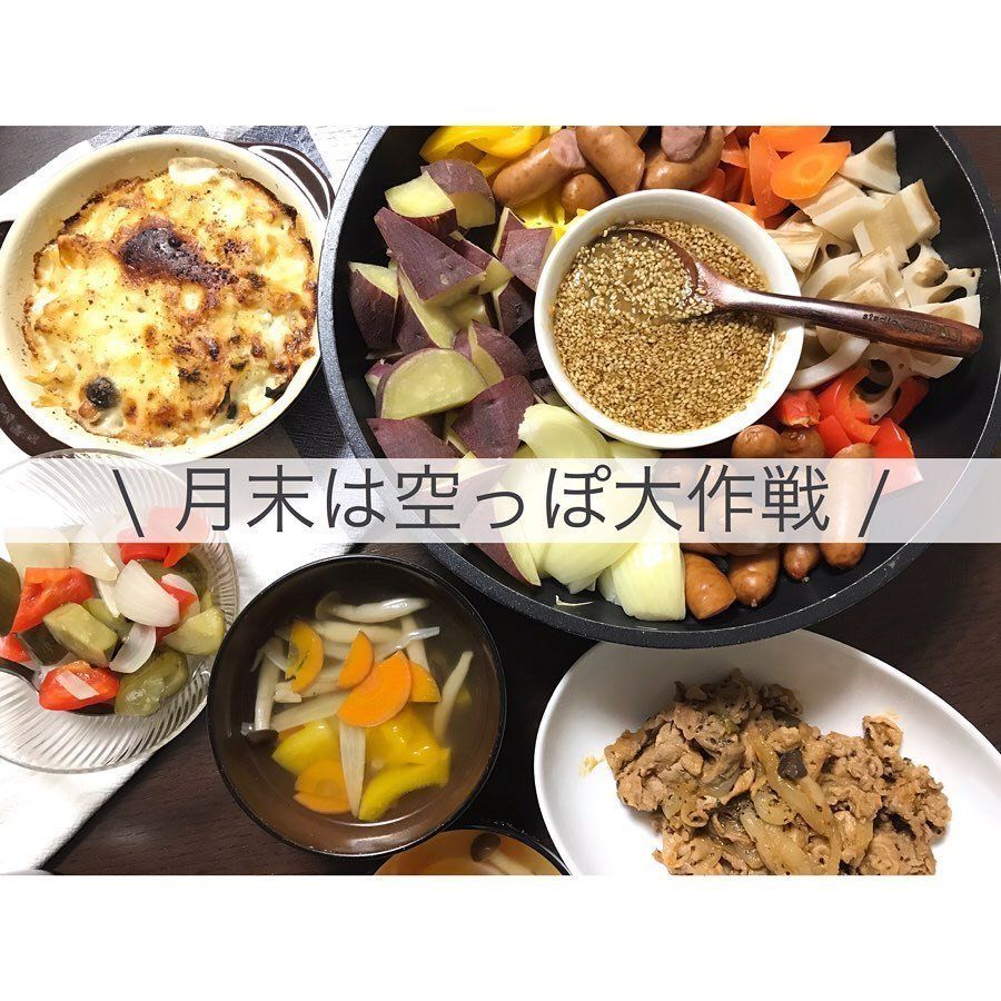 mayu.kakei_28さんは節約のために、下味冷凍とつくり置きのおかず、パッとできるおかずを組み合わせて一汁三菜となるような夕食の献立を心がけています。余ったおかずは翌日のお弁当に利用しながら、月食費3万円を目指しているのだとか。