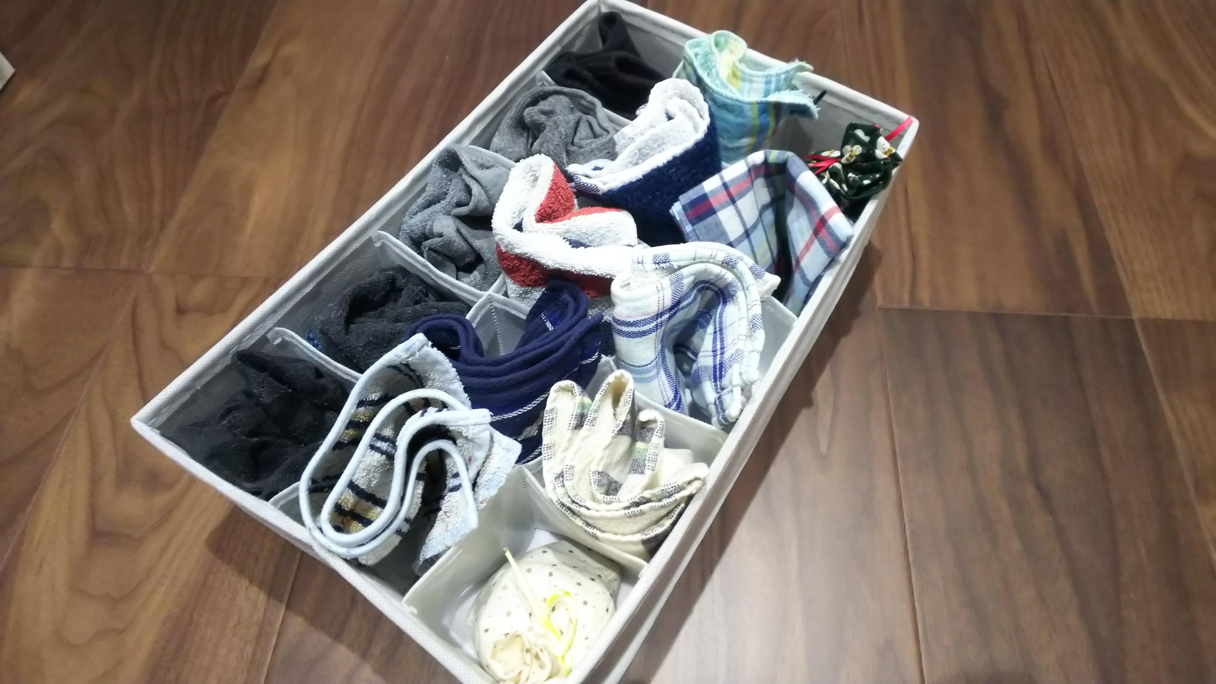 ひとつの例ですが、わが家では上の写真のように、こまかく仕切られたスペースに、靴下やハンカチなどの小さいアイテムを丸めてポンと入れています。不思議と散らかったように見えないので、このような収納だとズボラでも自然と続けられます。