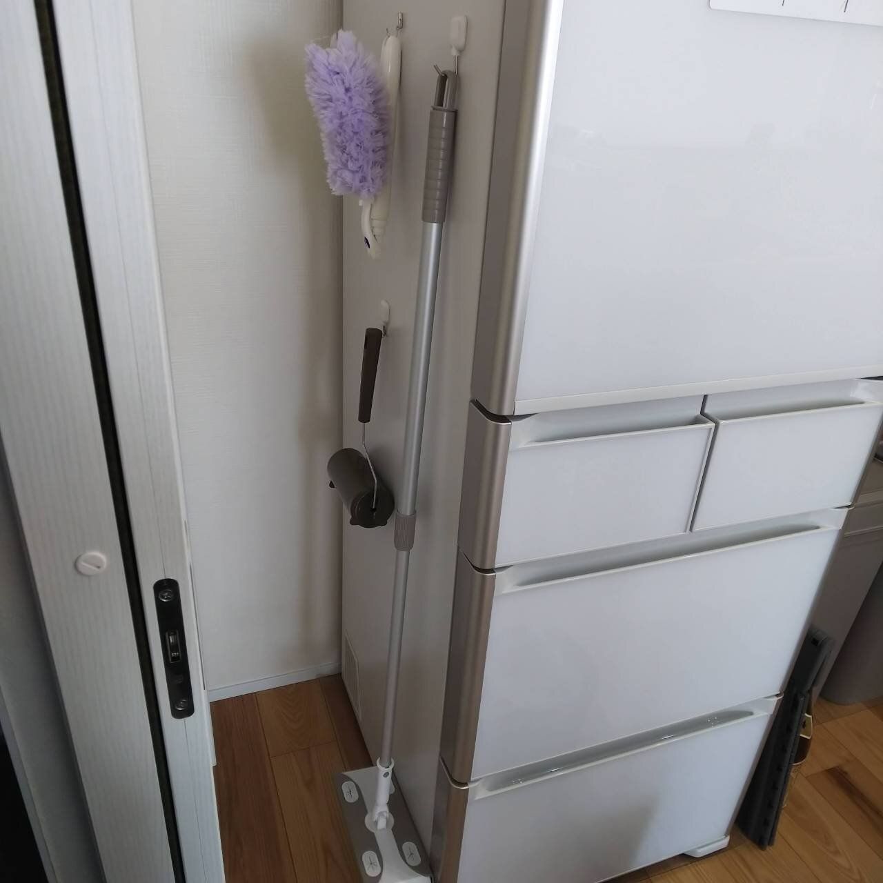 わが家では、冷蔵庫の横にフローリングワイパーやハンディモップなどのおそうじ道具を吊り下げています。