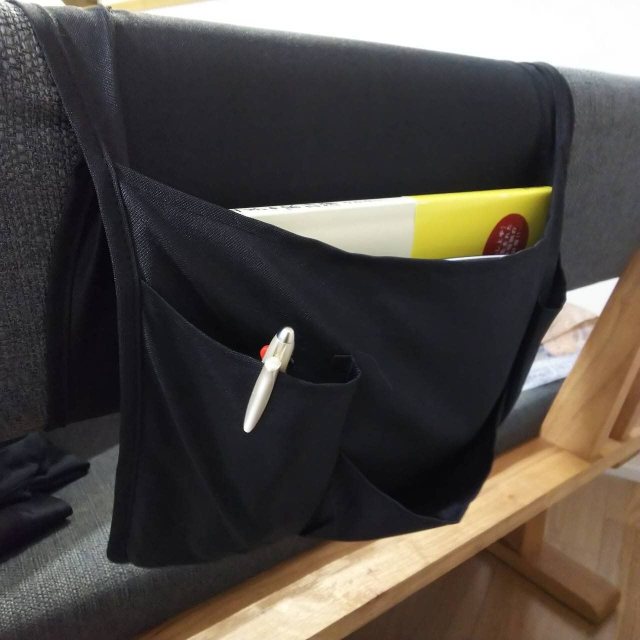 記入するのを忘れがちな家計簿は、座ったときに目に入るように、100均のアイテムを使ってイスに取りつけた収納袋に入れています。家計簿といっしょに、ペンや電卓も収納しているので、自然ときちんと書くようになりました。