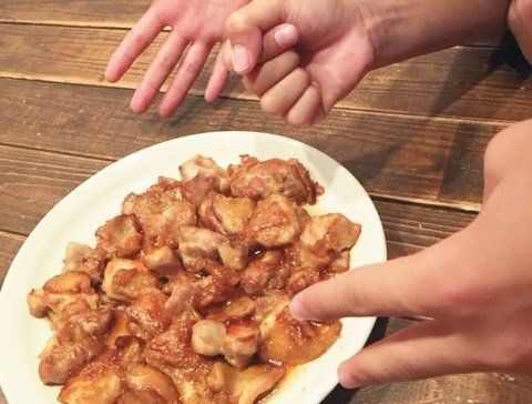 「鶏肉を大小が半々になるように切って揚げ、大皿にドカンと盛ります。ジャンケンで順番こに取るので毎回にぎやかです(笑)」。ハンバーグのときも同様に。時間をかけて食べられるため、ほどよく満腹中枢を満たせるのもメリット。(エリエリさん)