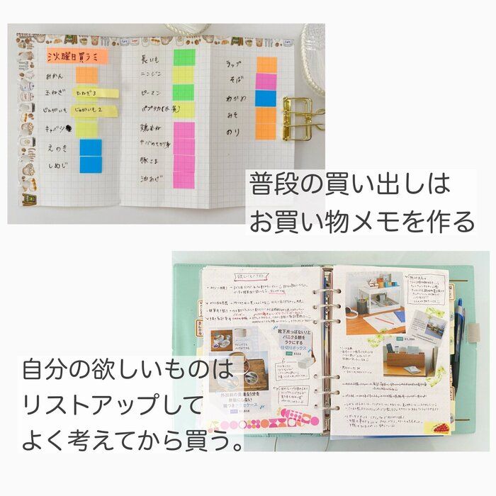 ふだん買うべきものやほしいものを、ノートにリストアップしてから買いものに出かけているというちぃこさん。ほしい理由や値段を書き出し、本当にほしいのかどうかをじっくり考えることで、自分に本当に必要なものが見えるようになったといいます。衝動買いやムダ買いも防げるようにもなったのだとか。