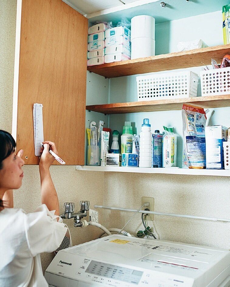 日用品のストックはこの棚に。「リストを印刷して棚の内側に貼っています。それぞれ最後の1個を棚から出すときに◯をつけ、そのまま買い物時のメモに。必要最低限の出費ですみます」。