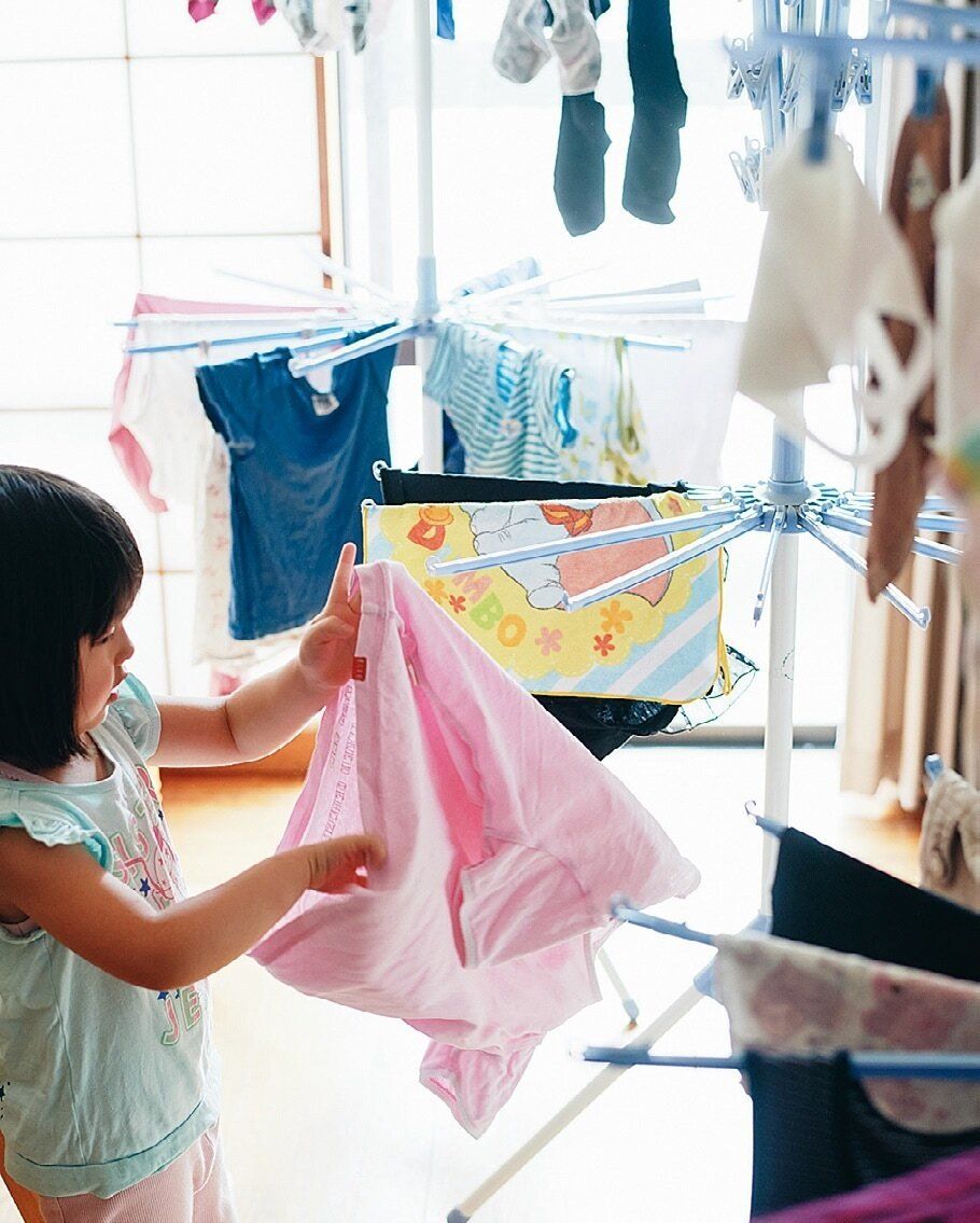 量が多い洗濯は子どもの仕事に。「朝ごはん前に下の子たちが干します。パラソル式のハンガーなら保育園児でも簡単に干せ、私が仕事に使える時間と体力の確保に」。