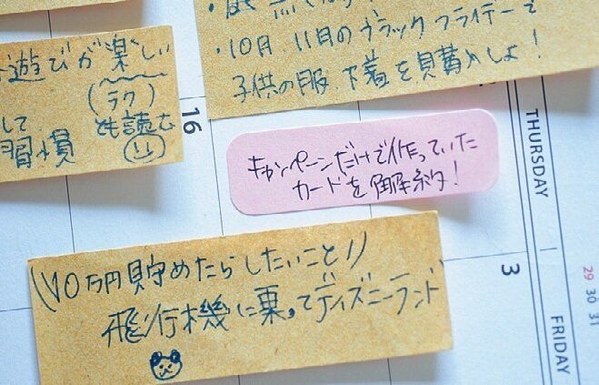 やりくりで気をつけたいことや自分を励ます言葉など、思いついたら付箋にメモ。家計簿に貼っておけば、見返したときに「また頑張ろう!」と思えます。