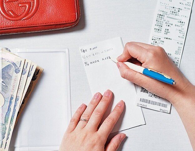 「カード払いした分は、使ったお金として財布から取り除きます。ただし、細かいのは面倒なので、四捨五入して1000円単位で。何に使ったかメモを添えておけば、わからなくなりません。翌月、まとめて、引き落とし用の口座に入金します」。