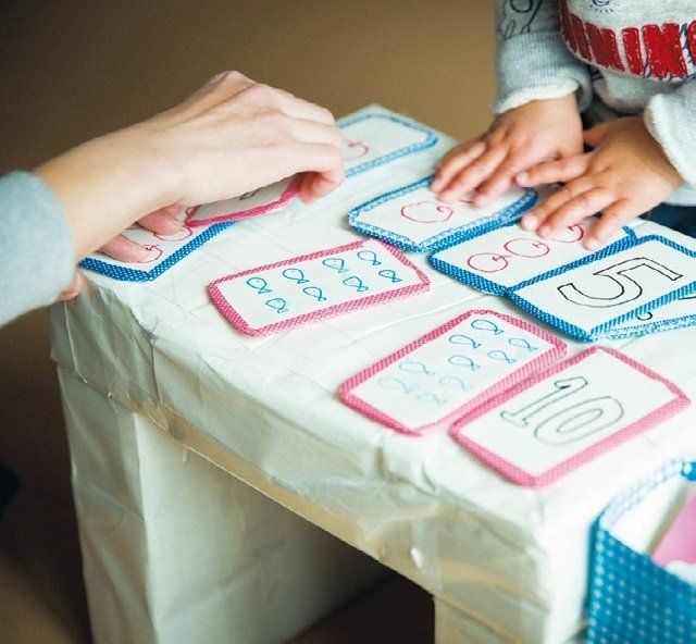 「おもちゃは流行りで選びません」。数字に興味を持ち始めたら段ボールでカードを作ったり、箱からティッシュを出すのが好きならガーゼを詰めておいたり、目的を考えてさっと手作り。「みんな持ってるから」じゃなくて、わが子が喜ぶ物を用意します。