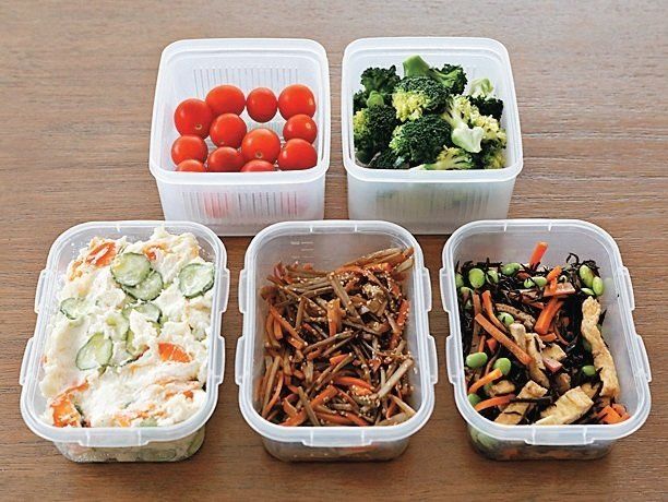冷蔵庫の2 ~ 3段目は、そのまま食べられる野菜や使い回しのきく常備菜を透明の容器で保存。きんぴらは卵焼きの具にしたり、ひじき煮はご飯に混ぜたりすればすぐに一品に。おかげで買いたしなしでも献立が充実。