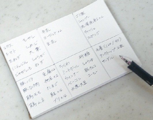 買い物メモは、売り場の並び順に合わせて、野菜→肉・魚→豆腐・牛乳など、6分割で記入。店内を進みながらメモの順番どおりに買えるので、ほかの物に目移りすることがなく、ムダ買い防止に!