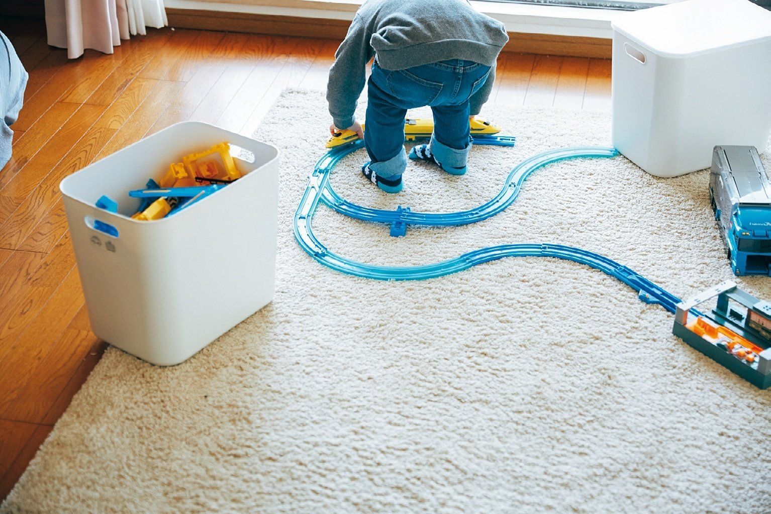 おもちゃは箱に入るだけ。「あふれたらどれかを捨てるルールに。子どももあれこれ欲しがらなくなりました」。