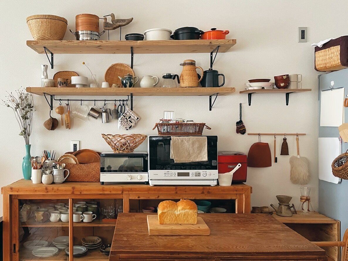 カトラリーは引き出しなどにしまい込まず、マグカップを使って食器棚の上に。ワンコーナーにまとめて、手前に子ども用を置いておくと、倒すこともなくスムーズにお手伝いしてもらえます。