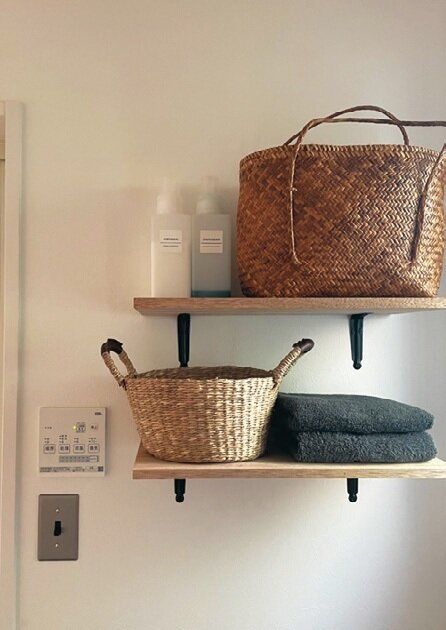 以前はトウのチェストにタオルをしまっていましたが、洗顔→ぬれた手で引き出しを開ける→中からタオルを取り出す、が地味に面倒で。オープン棚にポンと重ねておくだけにしたら解決!