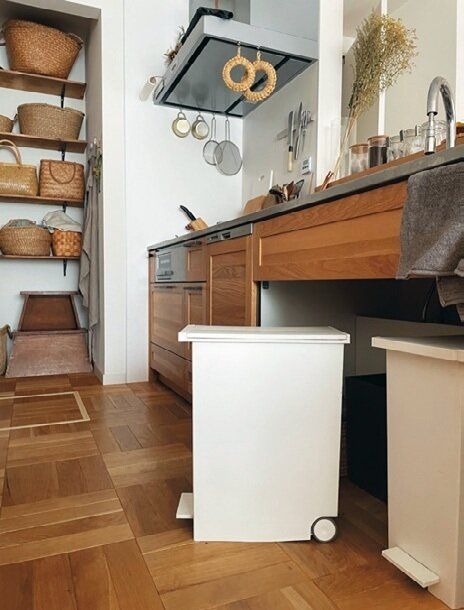 ゴミ箱は、キッチンのシンク下に置いた「KEYUCA」の物だけ。「部屋中のゴミ箱のゴミを集めて回るよりも、”1階のほぼ中央にあるゴミ箱”にそのつど捨てに来るほうがラクです」。