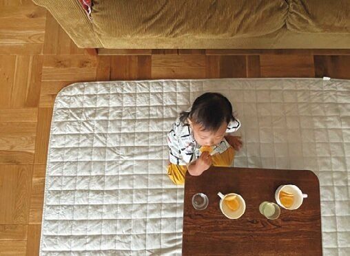 子どものおむつ替えやゴロンとさせておくのに便利で、リビングでは来客時以外、丸洗い可のラグを愛用。「飲み物などをよくこぼすので、薄手の物を数枚用意して2~3日に1回洗います」。