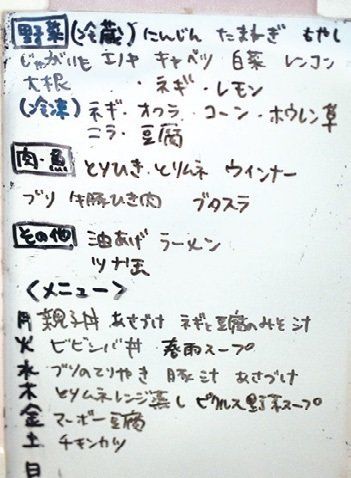 冷蔵庫の扉にホワイトボードを掛け、今ある食材と献立予定をメモ。疲れて外食欲が出たとき