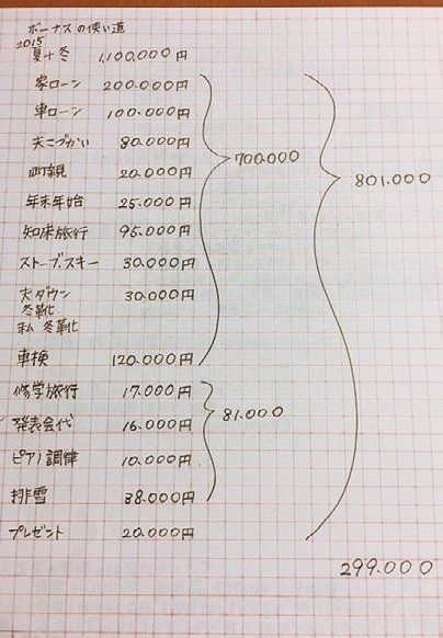 特別出費はボーナスで準備しています。年間でかかる固定費のほか、次年度必要になる学校関連費なども記入。大きな出費があっても焦らず、貯蓄もキープできるようになりました。