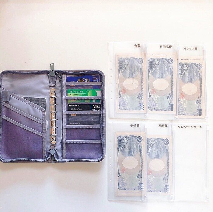 「食費は別の袋に入れ、日用品費や雑費などをパスポートケースのリフィルで管理。キャッシュカードや通帳などもひとまとめにして収納できるところが気に入っています。費目が増えたらリフィルを買いたせる安心感も無印良品ならでは!」。