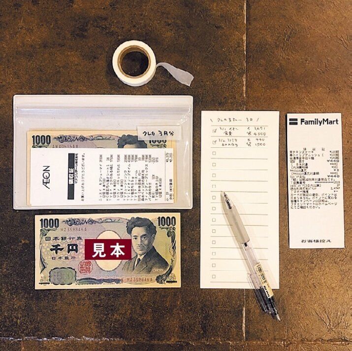 「キャッシュレス払いのお金も目で見て管理するため、こちらを活用。クレジットカード払いのレシート、同じ額の現金とともに、使った日や内容などを記入したメモをクリアーケースに収納。何月分かはマステに記入するとわかりやすい!」。