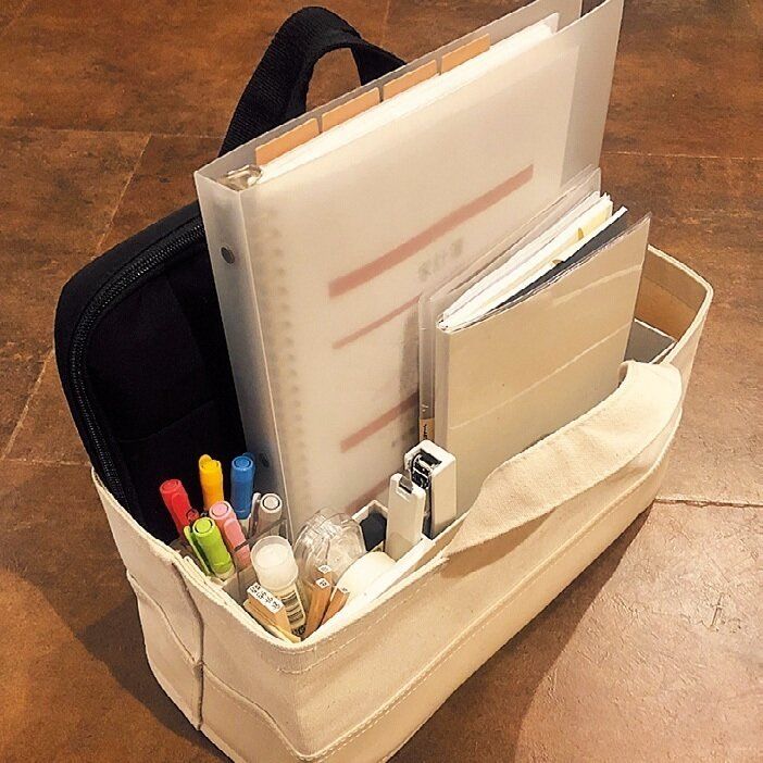 「いざ家計簿をつけようとしても、道具がバラバラに置いてあるとおっくうに。私は布バスケットを家計簿グッズの定位置にしています。自立するように、バスケットの中にボックスを仕込むのがポイント。ペンが迷子にならないポケットも便利ですよ!」。