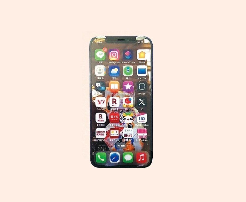 LINEやインスタグラムなどのSNS、楽天系のアプリをよく使うので、TOP画面にまとめて配置。あまりこだわりはないのですが、待ち受け画面は金運が上がりそうな招き猫の写真に。