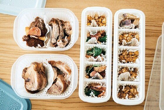 つくりおきを作ったら、そのままおべんとう用に小分け。「5日分のおかずがあっという間に完成」。