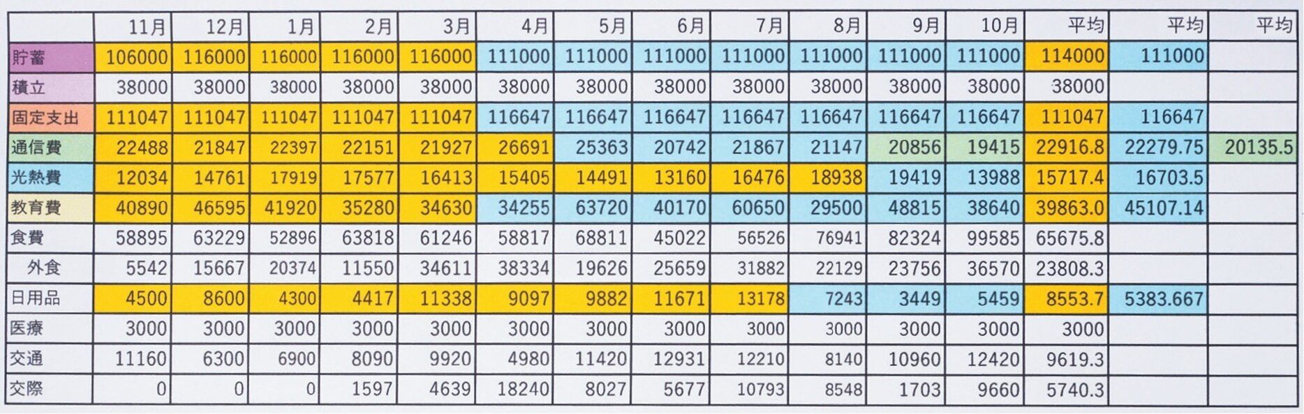 月毎に費目別(貯蓄、積立、固定支出、通信費、光熱費、教育費、食費、日用品、医療費、交通費、交際費)に整理し、年間支出表を作成。