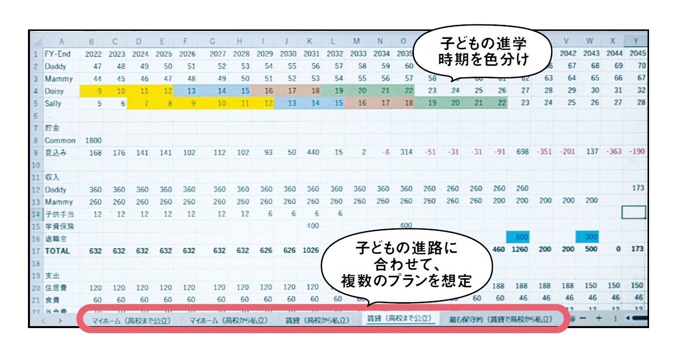 妻が90歳までの収入・支出・貯蓄の変動を予測。「賃貸住宅のままで子どもが公立高校、私立高校に入学した場合、マイホームを購入した場合など、ケースに合わせて予測したら、備えなければいけない金額の目安がわかりました」。