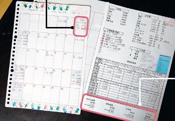 フルタイム勤務のRさんの家計管理は、“タイパ”重視!省労力で効率よく、全体の支出がチェックできるようにたどり着いたのが自作のルーズリーフ家計簿です。「カレンダーでお金を使った日に金額をメモして、月末に全体の収支一覧に記入するだけ。1カ月2シートずつなので、保管しやすく、年間で見返したいときも便利!」。