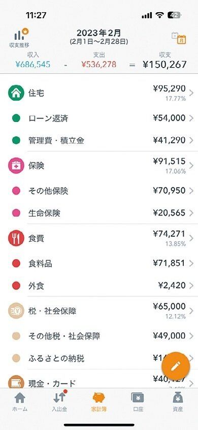 共働きの収支を一つにまとめるため、家計簿アプリを夫婦で共有。「基本的に、生活費のほとんどをカード払いにしています。アプリに銀行口座とクレジットカードを連携していて、使ったら自動的に反映されるので、自分で入力する手間もありません。週1回、カードの利用履歴で食費、日用品費の金額をチェックして、予算オーバーしそうなら翌週は控えるなどして調整しています」。