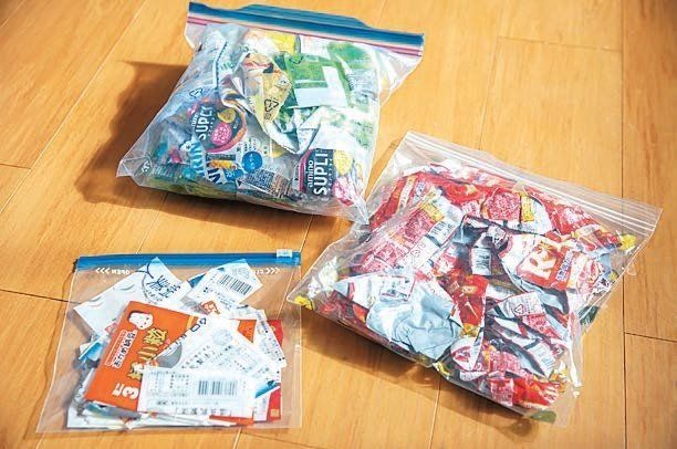 懸賞によって必要になる部分が違うので、パッケージごと保存袋にポイポイ入れておきます。「商品を開封したついでにはさみでザクザク切って、種類ごとにざっくり分けるだけです」。