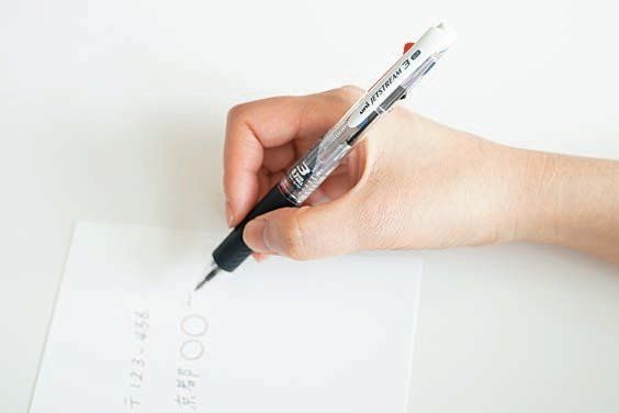 ハガキを書くときに使うのは、JETSTREAMの3色ボールペンだけ。芯は0.7mm と太め。「クッキリ書けて読みやすいですよ」。