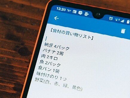 メモ帳アプリに、定番の食材リストを入力。「これをベースに、足りない食材をこのリストに足せば、ムダ買いせずに済みます」。