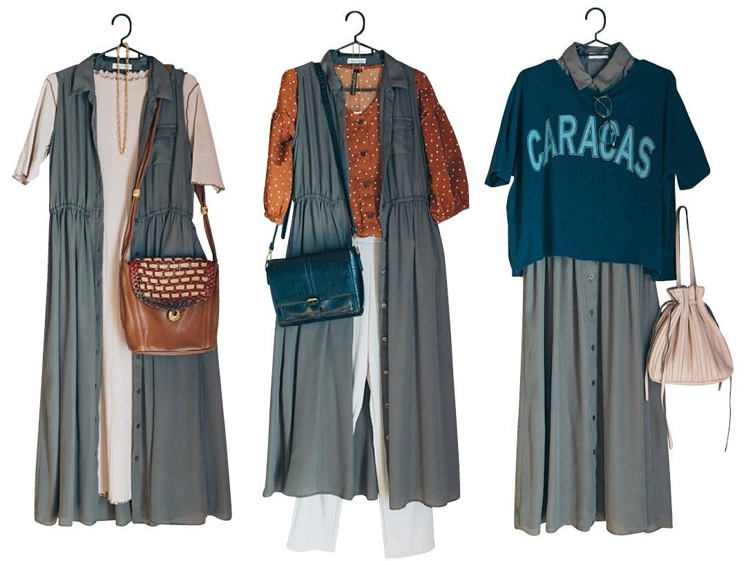 例えば、前開きできるワンピースなら、羽織りでもインでも使えて便利。「おしゃれな友人にアドバイスしてもらうことで、Tシャツ1つとってもムダのない買い物ができるようになりました」。