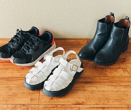 靴は服のテイストに合わせて変えるものと思い、たくさん揃えていました。「今はベーシックな黒のスニーカー、ショートブーツ、白いサンダルのみ。十分使い回せます」。