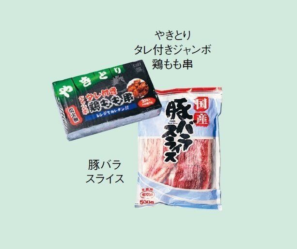 豚バラスライスはグラム単価が安く、国産なのも高ポイント。鶏もも串は串から外して味つきの鶏肉として使うと、レパートリーが広がる!