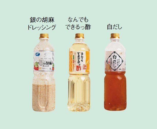 酢はこれ1本で酢のものも酢めしも味がピタリ。白だしはあえもの、肉の下味などに。ごまドレッシングはサラダだけでなく、ごまだれ代わりにも使えて重宝。