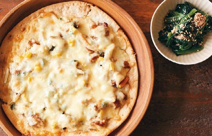 ピザ生地に串から外した焼きとり、ごぼうにんじんミックス、コーン、青ねぎ、とろけるチーズをのせてオーブントースターで焼く。焼きとりのたれが濃いので、味つけはマヨネーズを少したす程度でOK。副菜はカットほうれん草とツナを白だしであえるだけ。