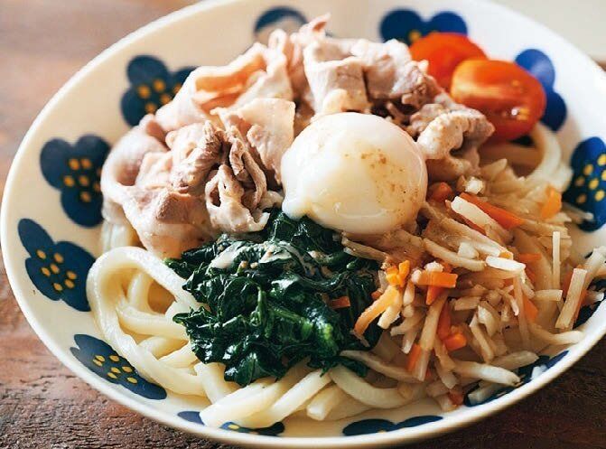 うどんの上にゆでた豚バラスライスを盛り、カットほうれん草、ごぼうにんじんミックス、ミニトマト、温泉卵をトッピング。仕上げにごまドレッシングをかければ、でき上がり。