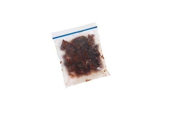 氷コーヒー(冷凍用保存袋の半分を目安にコーヒーを入れて冷凍)を作る。牛乳を注いだグラスに手で砕いた氷コーヒーを入れる。