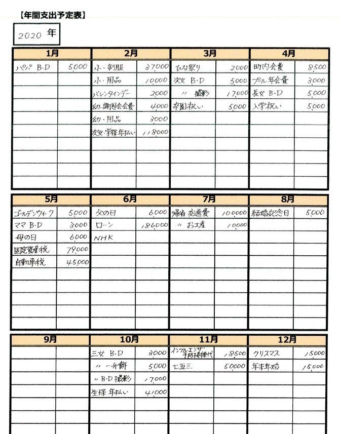 イベント費や年払いするものなど、年間の特別出費の予定を月ごとに記入。「特別出費の予算をボーナスから取り置いておけば、毎月の収支に影響せず、貯蓄がキープできます」。