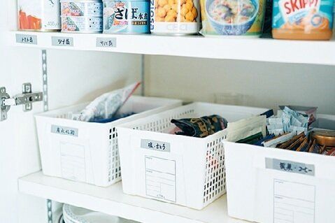 ラベルは分類しているカゴやボックスのほか、棚板部分にも直接ペタリ。「母がわかりやすいのはもちろん、私がそこに他の物を置いてしまうのを防ぐ効果も」。