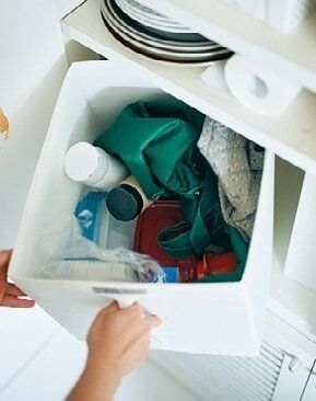 放り込み収納には「デカッ」と思うくらい大きめのボックスがラクチン。形もサイズもまちまちなべんとう関連のアイテムは、IKEAの収納ボックスにひとまとめ。