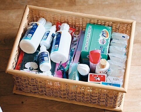 コンタクトレンズの洗浄液、もらい物の石けんや入浴剤、旅行用のサンプルなど、分類に迷う物は深すぎないカゴに一括収納。「ここを探せば見つかるとわかっているから安心」。