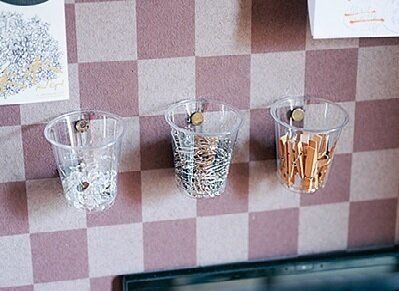 画びょうやクリップなどの細かくて散らばりやすい文房具は透明カップに入れ、壁に画びょうでペタッ。「小さい物は分けて収納する方が、出し入れに手間取りませんよ」。