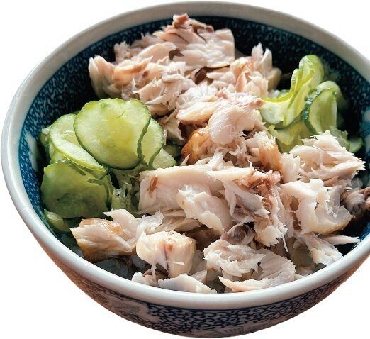 酢めしの上に、焼いて身をほぐした塩さばと、塩もみしたきゅうりをのせるだけ。魚が苦手な子どもにも。