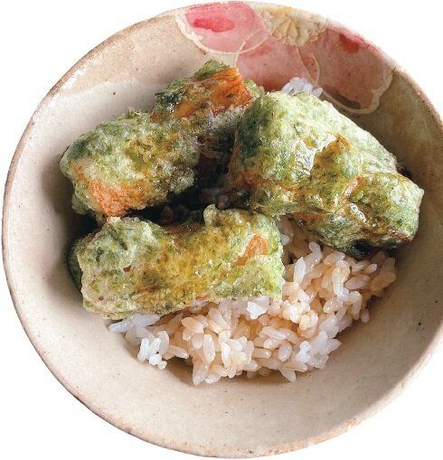 ちくわは天ぷら粉、青のり、水を混ぜたころもをつけて、揚げ焼きに。照り焼きのたれをかけたご飯にON。