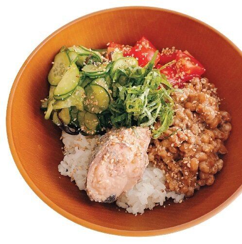 納豆があれば、あとはアボカド、鶏ハム、しらす、野菜など何でもOK!この日はさば缶。温泉卵をプラスしても◎。