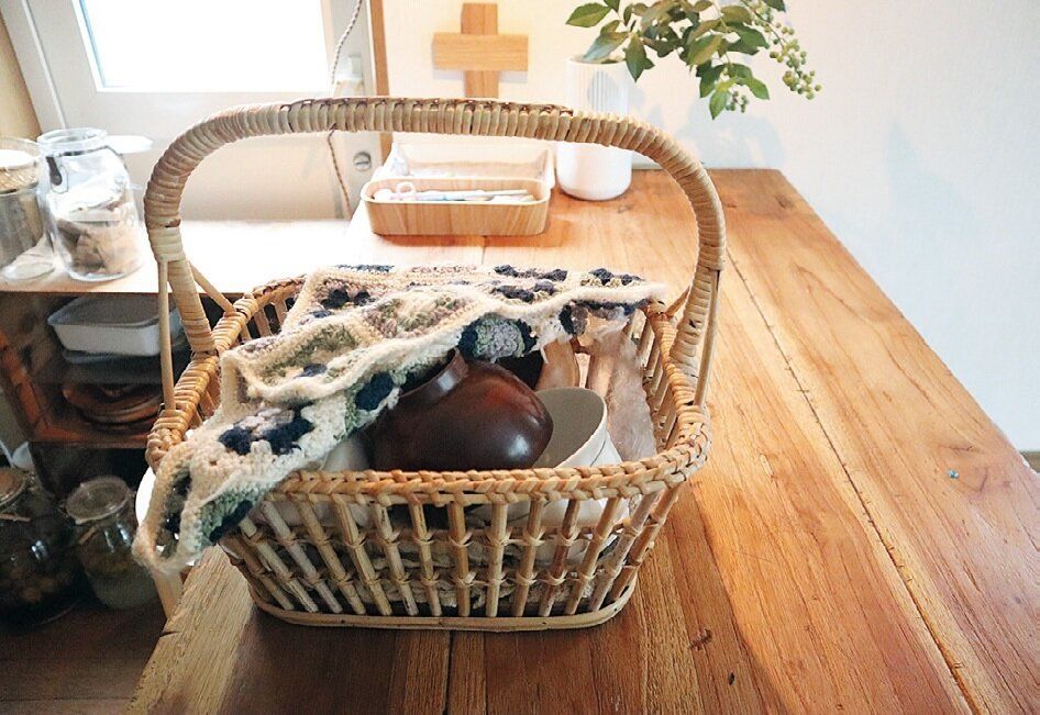 「食器棚にしまうのをやめて、洗って拭いたあとかごにポンと入れるだけにしたら手間が省けてラクに。以来、家中ワンアクションで出し入れできる収納に変えてスッキリ」。