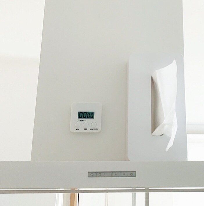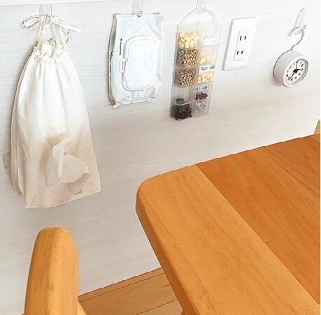 食卓近くのキッチンの壁面を使って、食事用のウエットティッシュや飲み忘れたくないサプリをつるす収納に。akiさんの席から座ったまま手に取れて、リビングからは見えにくい絶好のポジション!